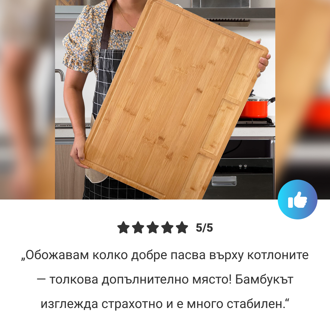 Тази дъска за рязане е невероятна! Обожавам голямата повърхност, а подвижните крака я правят лесна за съхранение. Перфектна е за рязане на големи предмети и мога да я използвам и като плато за сирене. Наистина си заслужава.