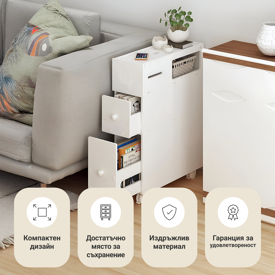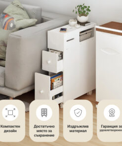 - Голямо пространство за съхранение: Разполага с чекмедже и отворени рафтове за организация.