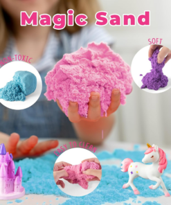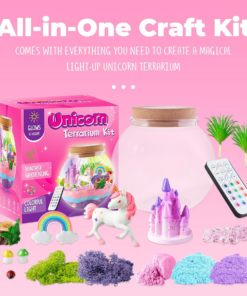 Комплектът съдържа всичко необходимо: цветен пясък, кристали, фигурка на еднорог, замък, дървета и други магически елементи.
